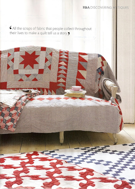 Everyone knows that the BBC is an extraordinary organisation. But, for some reason, I had always imagined Homes & Antiques to be a rather dull magazine... well, I was completely wrong! What caught my eye at first was the amazing photo styling, and then I saw the homes they feature, as well as the clever mix of antique and modern pieces... I think I'm going to subscribe to it! The theme for the March issue is quilts and of course I immediately thought of showing you some of its inspiring pages.